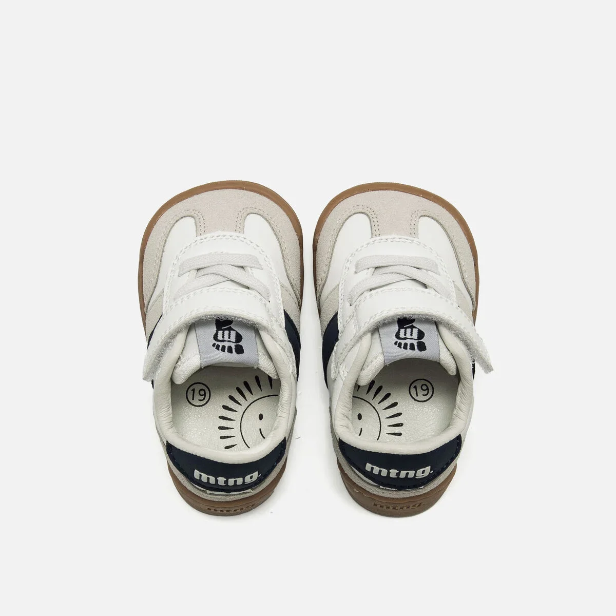 Tênis esportivos brancos para bebês da marca Mtng, modelo Free Baby, com detalhes em marinho e estilo casual inspirado nas sneakers clássicas. Combinam painéis lisos e textura tipo camurça em cinza, e têm fechamento adesivo junto a cadarços elásticos que melhoram o ajuste e o conforto. A sola em cor caramelo contrasta com o corte superior e dá um toque atual ao design. Com certificado VEGANO selado pelo INESCOP, que garante que a natureza química principal do material não corresponde a fibras de origem animal. Projetado e desenvolvido especialmente em colaboração com o Dr. Juanjo López, traumatologista esportivo e infantil, para respeitar o desenvolvimento natural do pé das crianças. Graças à sua biqueira larga, permite o movimento livre dos dedos dentro do sapato. Sua sola tem 3 mm de espessura e zero drop (totalmente plana), respeitando o desenvolvimento natural do pé do pequeno e seus elementos flexíveis e torsionáveis fazem com que o pé da criança não fique aprisionado pela estrutura do sapato. As palmilhas removíveis facilitam verificar se o tamanho do calçado está correto para o seu filho. Além disso, sua fácil abertura permite que a criança possa descalçar-se e calçar-se de forma autônoma. Acompanhe os primeiros passos do seu bebê com mtng.