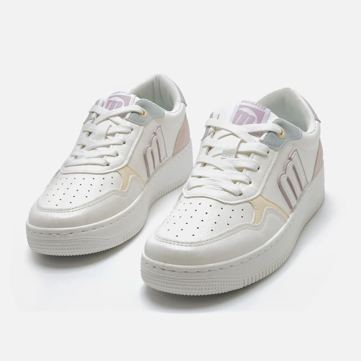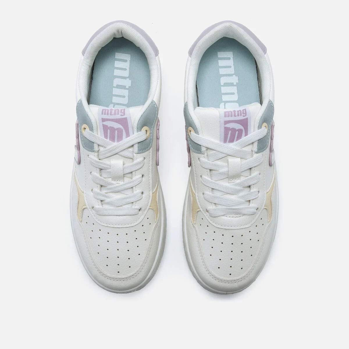 Ténis brancos para mulher da marca Mtng, modelo Gravity, de estilo urbano com detalhes em tons pastel. Este design combina painéis em cores suaves como lilás, rosa, azul e amarelo, proporcionando um visual fresco e jovem. A silhueta clássica de cano baixo com perfurações na biqueira favorece a respirabilidade, enquanto a sola larga proporciona estabilidade e conforto. Fecho com atacadores e acabamento acolchoado para maior conforto. Perfeitos para dar um toque de cor a looks casuais sem perder funcionalidade.