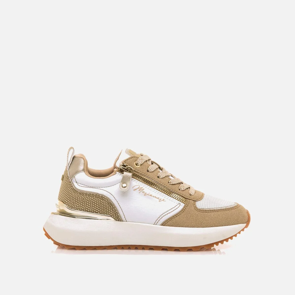 Tênis branco e bege para mulheres da marca Mariamare, modelo Hoku com estilo urbano e detalhes esportivos. Esse design combina painéis de malha, acabamento tipo camurça e metálico no calcanhar, que adicionam textura e um toque distinto. Inclui um zíper lateral funcional que facilita o ajuste, além do fecho com cadarços. A sola grossa e serrilhada adiciona altura sem sacrificar o conforto. Um modelo versátil que se adapta a diferentes visuais casuais com um design cuidadoso e marcante.