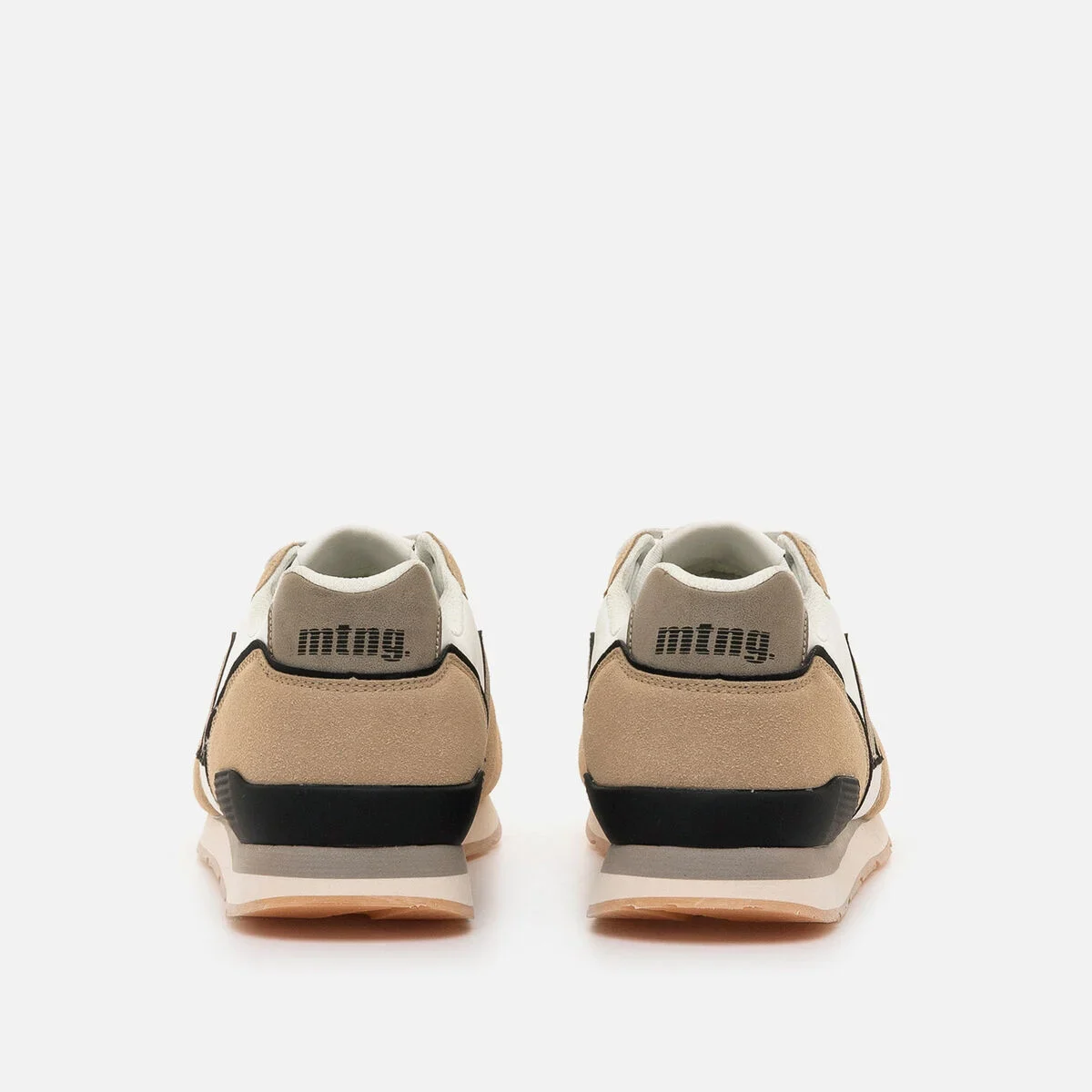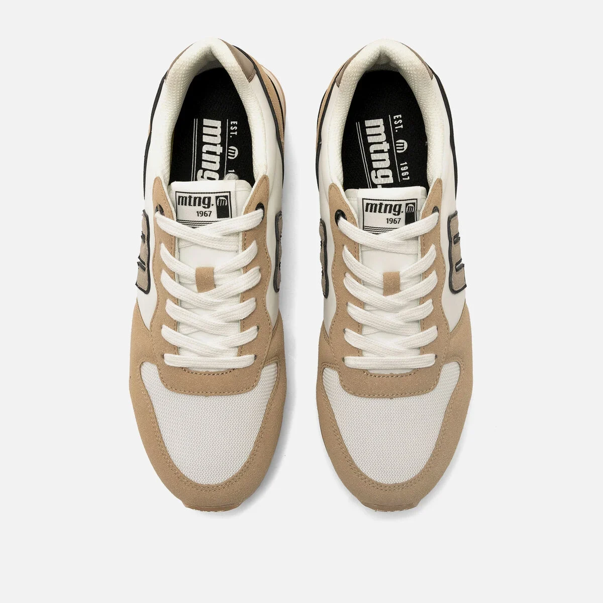 Ténis masculinos em branco e bege da marca MTNG, modelo Joggo de estilo casual. Este design combina painéis em malha com reforços de efeito camurça, oferecendo um visual versátil. A sola de perfil baixo melhora a tração sem perder leveza, enquanto o logótipo lateral em contraste dá um toque diferenciado. Perfeitos para uso urbano, graças ao conforto e ao acabamento intemporal que combina facilmente.