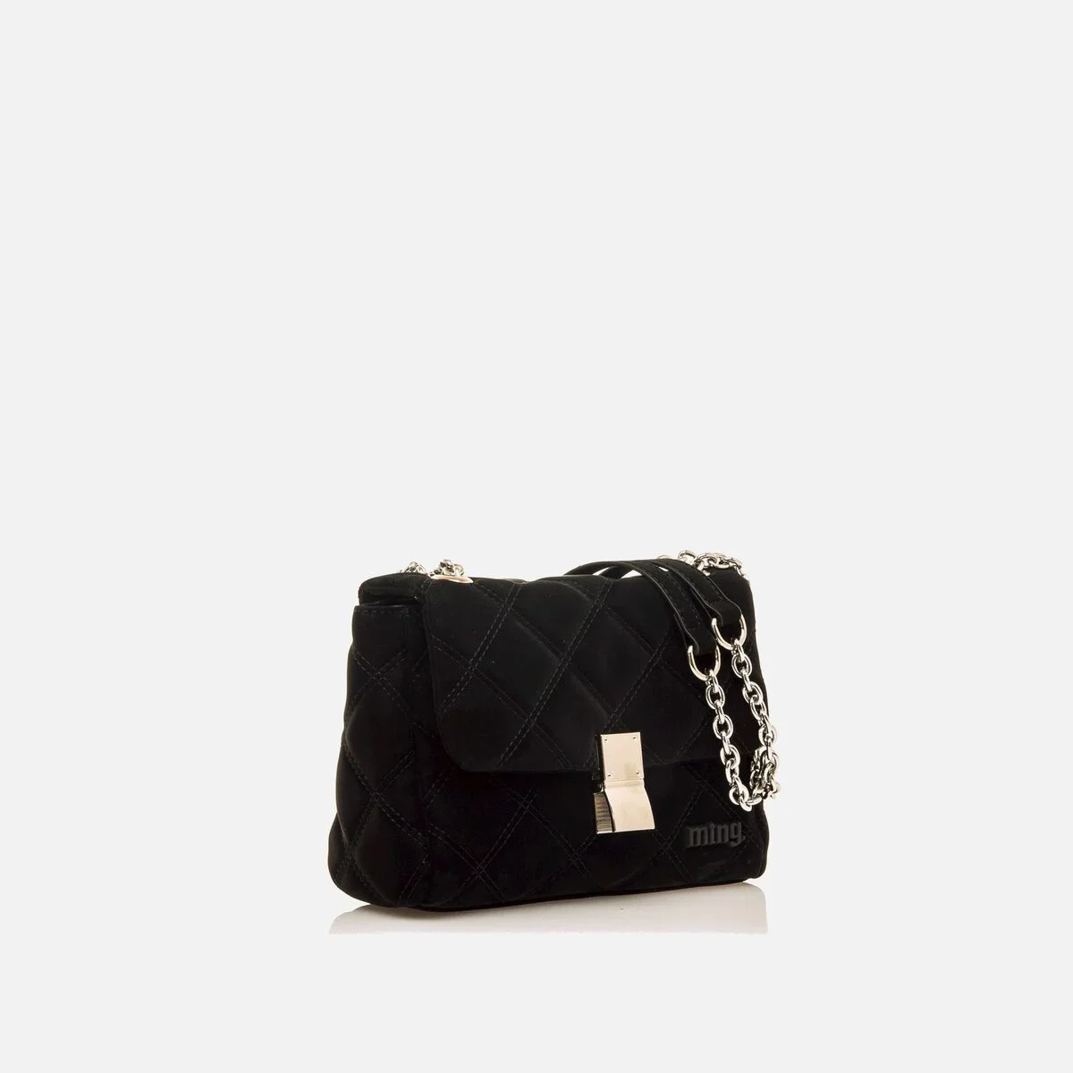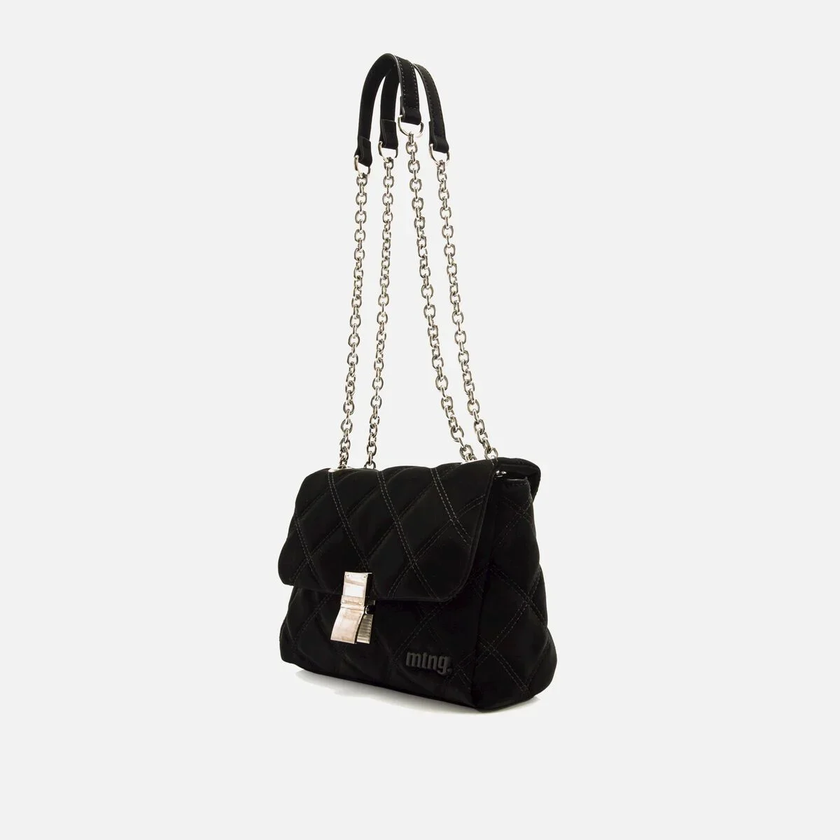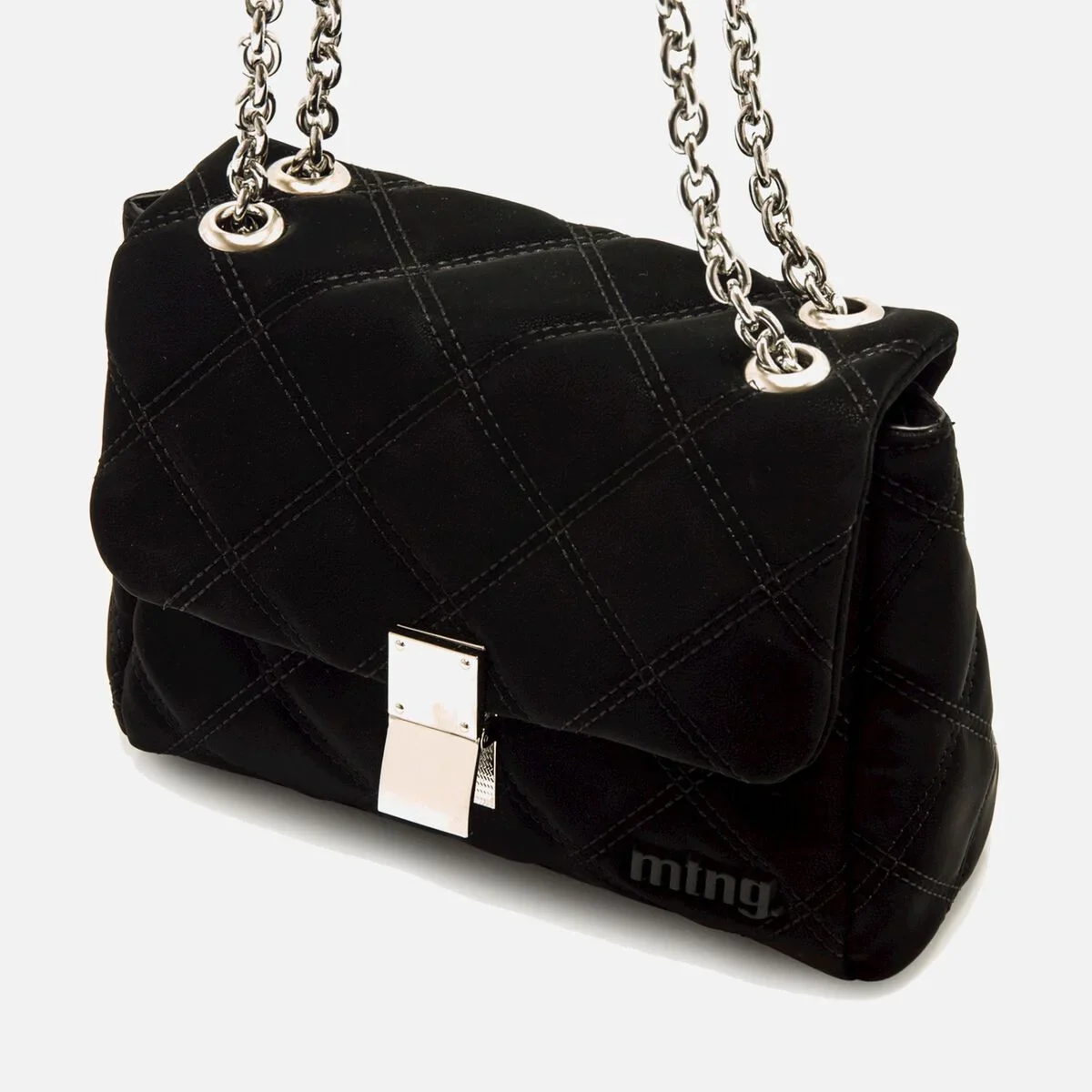 Bolsa tipo tiracolo preta para mulher da marca mtng, modelo June. Bolsa acolchoada com pespontos em forma de losango, com aba frontal e fecho metálico, acompanhada de logótipo em preto. Conta com uma alça dupla de corrente metálica com reforço, proporcionando maior conforto ao ombro. Interior forrado com compartimento principal e bolso com fecho de correr para pequenos objetos. Um modelo sofisticado e funcional, ideal para elevar os teus looks tanto de dia como de noite.
