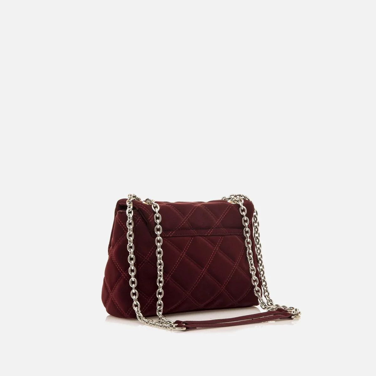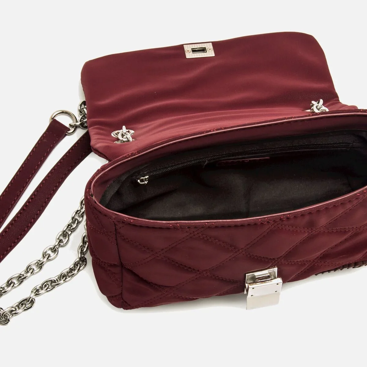 Bolsa tipo tiracolo cor bordô para mulher da marca mtng, modelo June. Modelo acolchoado com costuras em forma de losango que conferem textura e estilo. Design com aba e fecho metálico em tom prateado, que contrasta elegantemente com a cor da bolsa. Alça dupla de corrente com reforços para maior conforto ao ombro. Interior espaçoso com compartimento forrado e bolso interior com fecho de correr. Um design versátil e atual que acrescenta cor aos teus looks urbanos.