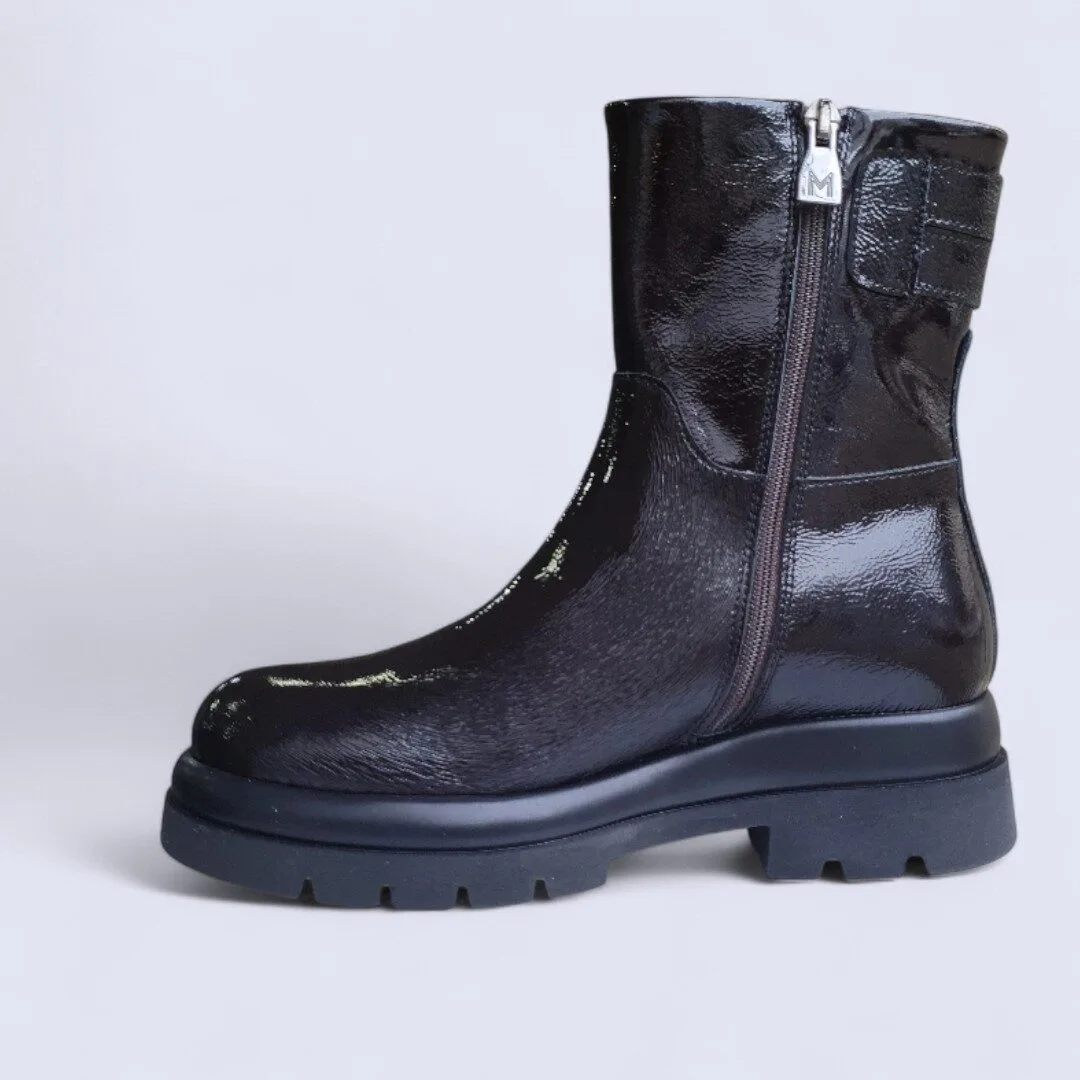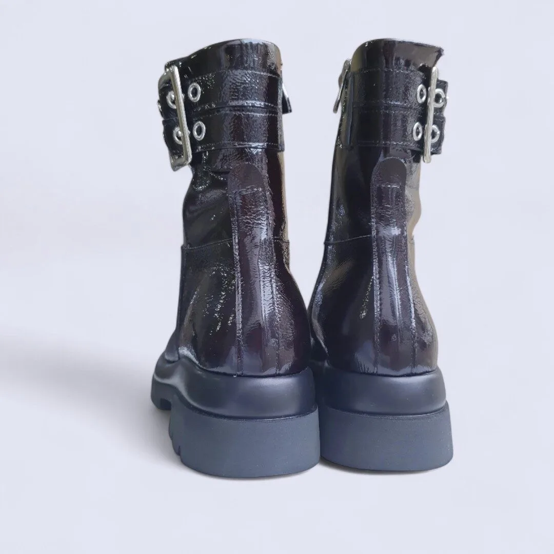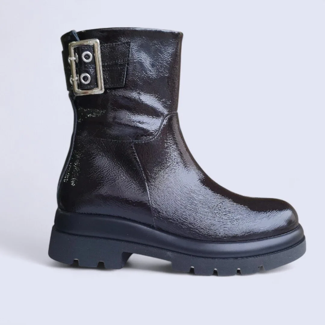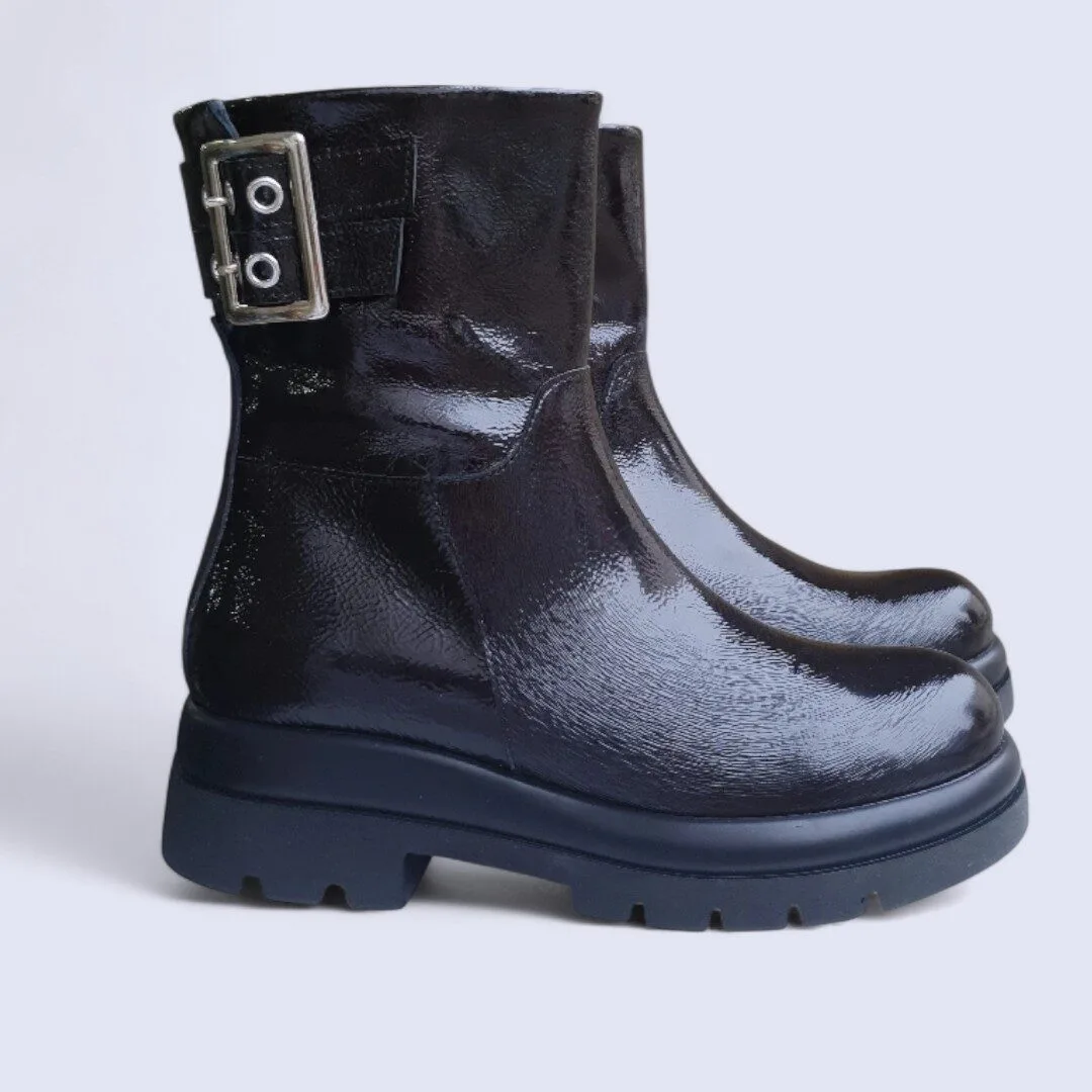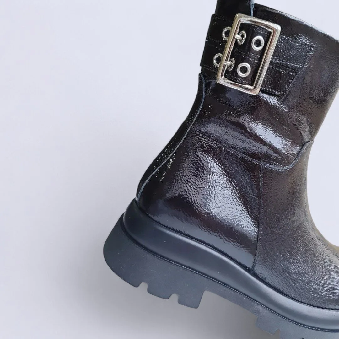 Elegante e moderno, este botim em pele de alta qualidade destaca-se pelo seu acabamento em verniz e sola plataforma, que garante conforto e estilo. Possui fecho lateral e duas fivelas ajustáveis, acrescentando um toque sofisticado e contemporâneo ao seu look.