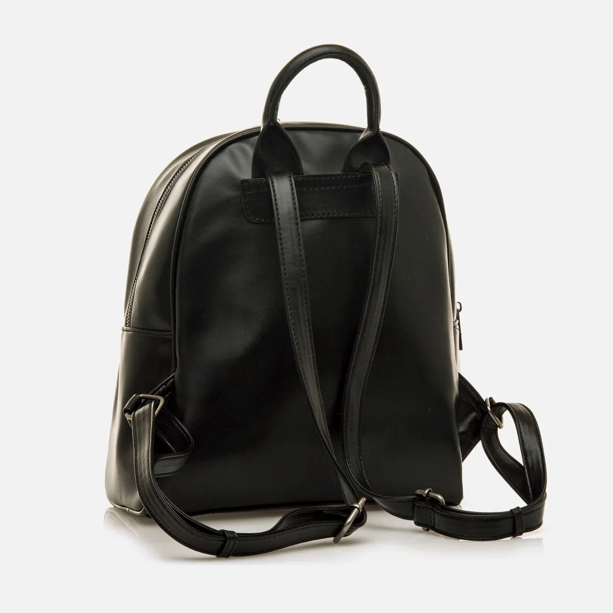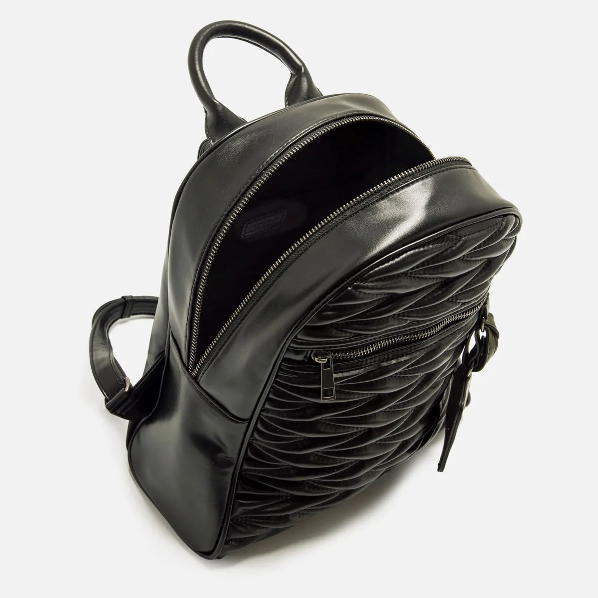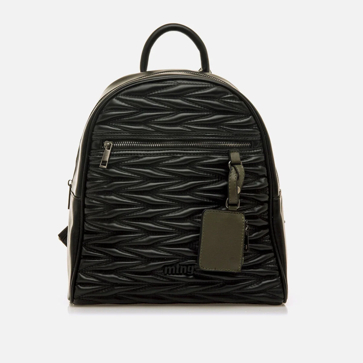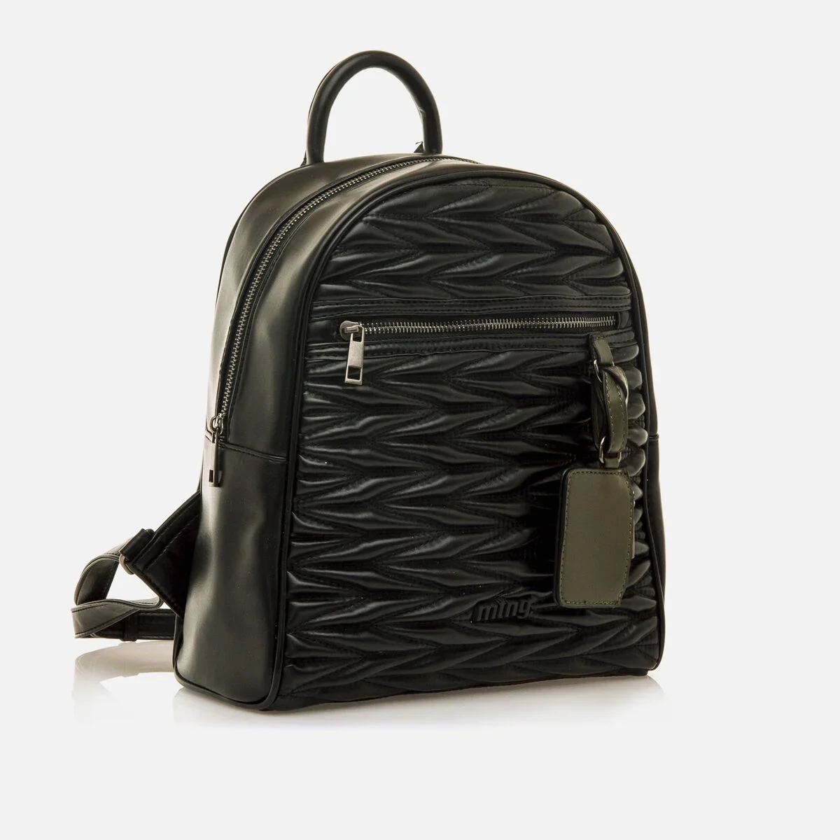 Mochila preta para mulher da marca Mtng, modelo Priya, de estilo urbano. Esta mochila combina um design acolchoado com padrão geométrico com acabamento liso em preto nos laterais e na parte traseira. Inclui um bolso frontal com fecho éclair metálico e uma pequena bolsa porta-moedas pendente em tom caqui, que adiciona um toque distintivo. O seu tamanho compacto e as alças ajustáveis tornam-na ideal para o dia a dia, oferecendo funcionalidade sem abdicar de estilo.
