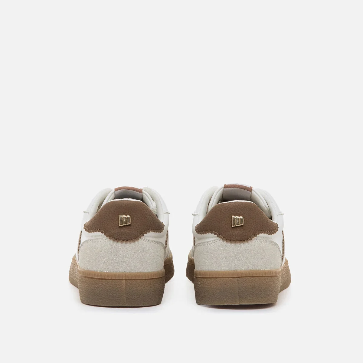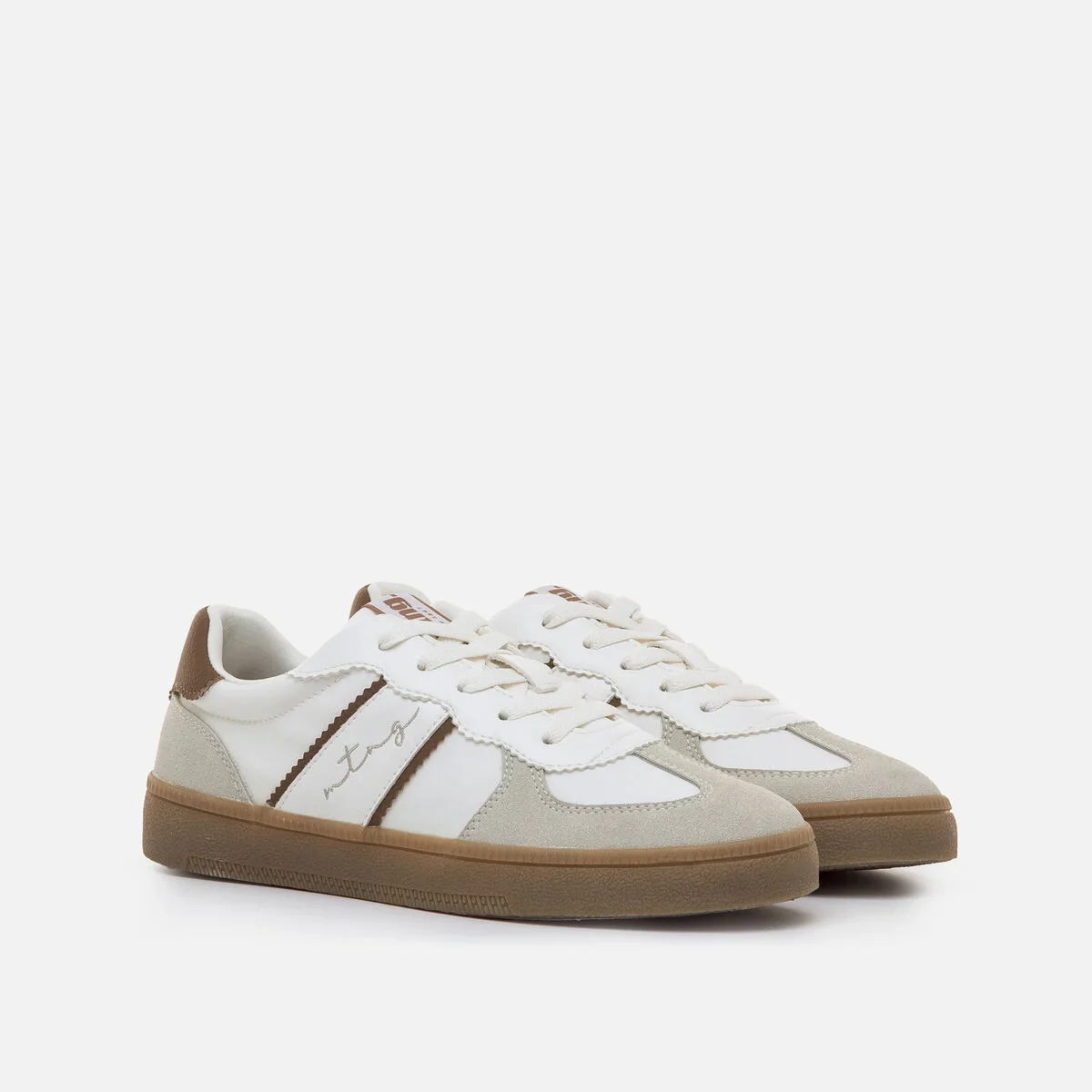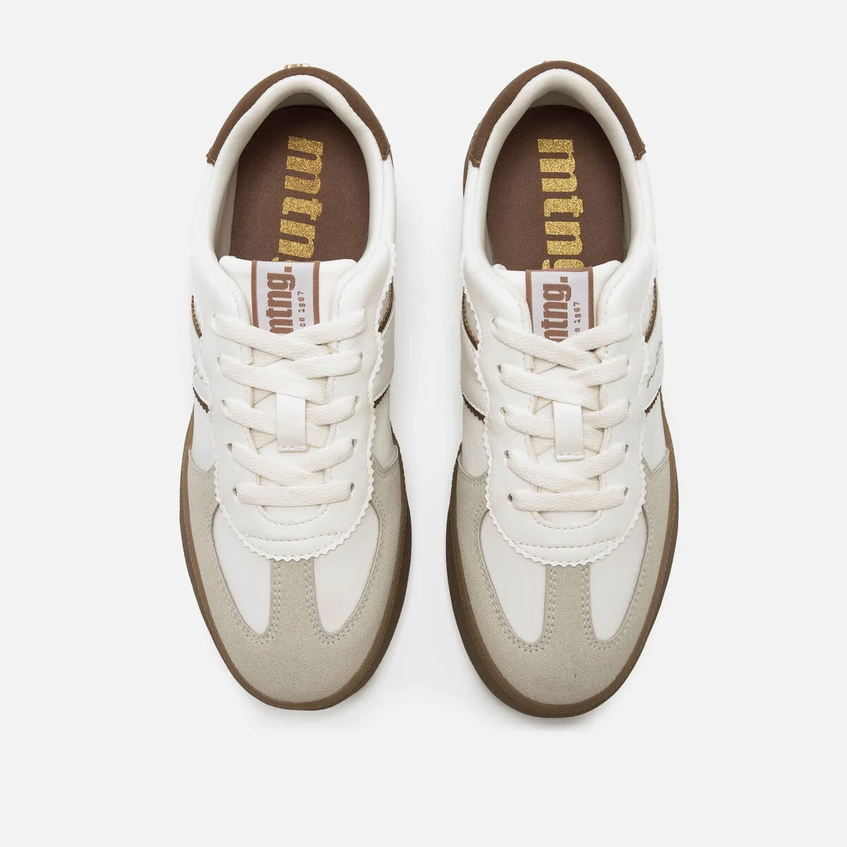 Ténis brancos com detalhes em bege e castanho para mulher, modelo Roy da Mtng. O design combina uma base clara com contraste no calcanhar e nas bandas laterais, dando um ar retro muito versátil. A sola de borracha em cor caramelo oferece boa aderência e um acabamento clássico, ideal para uso diário. Com logótipo lateral bordado e uma silhueta inspirada no calçado desportivo vintage, este modelo é perfeito para visuais relaxados com um toque moderno.