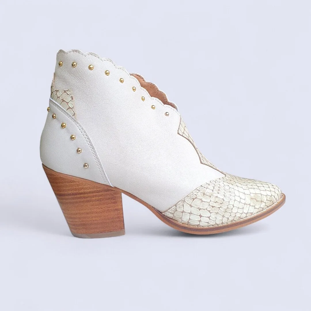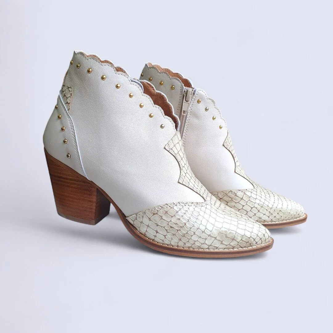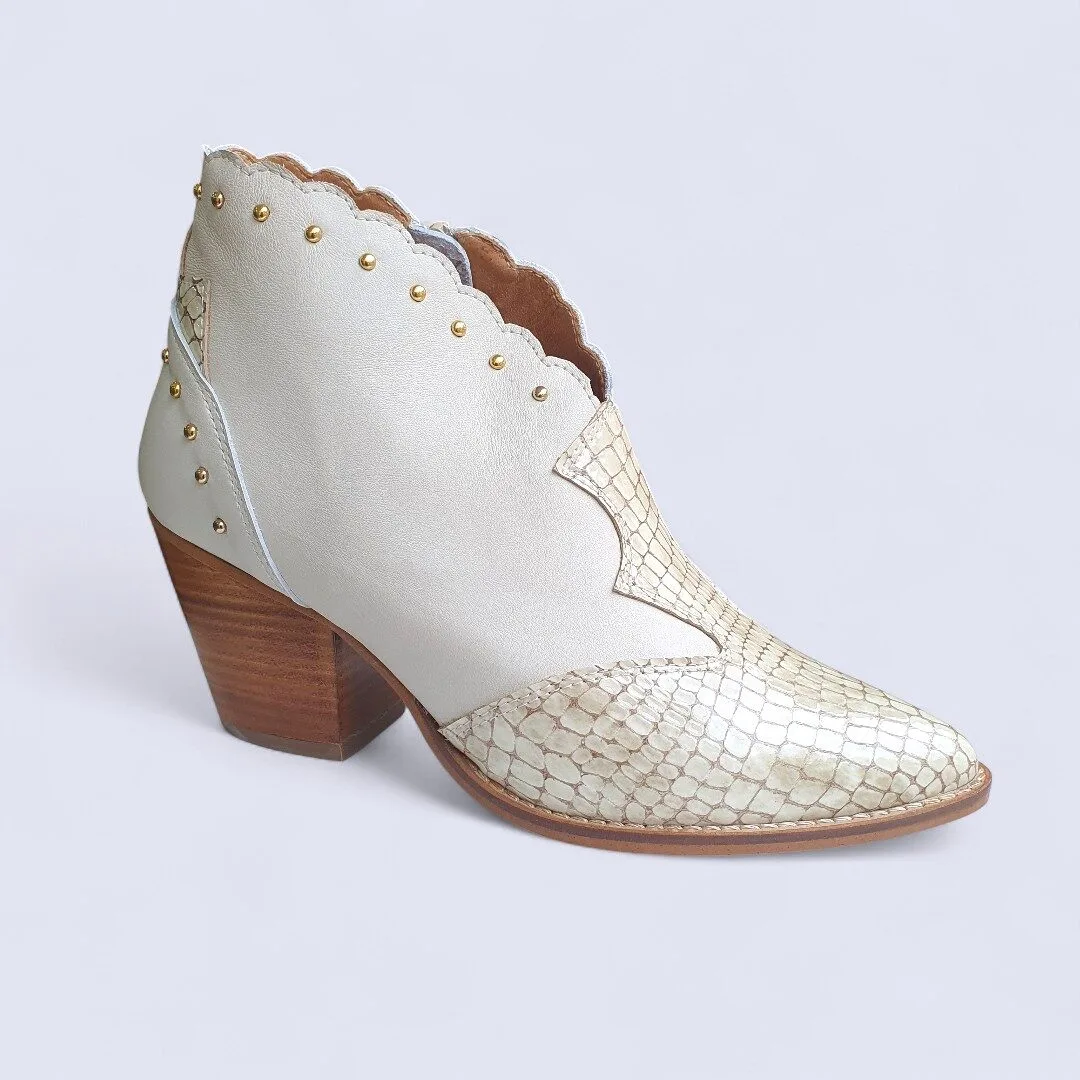 Estas texanas em pele genuína, fabricadas em Portugal, aliam qualidade, conforto e um design cheio de personalidade. O modelo apresenta um fecho lateral discreto, que facilita o calçar, e detalhes em tachas douradas que conferem um toque de sofisticação.