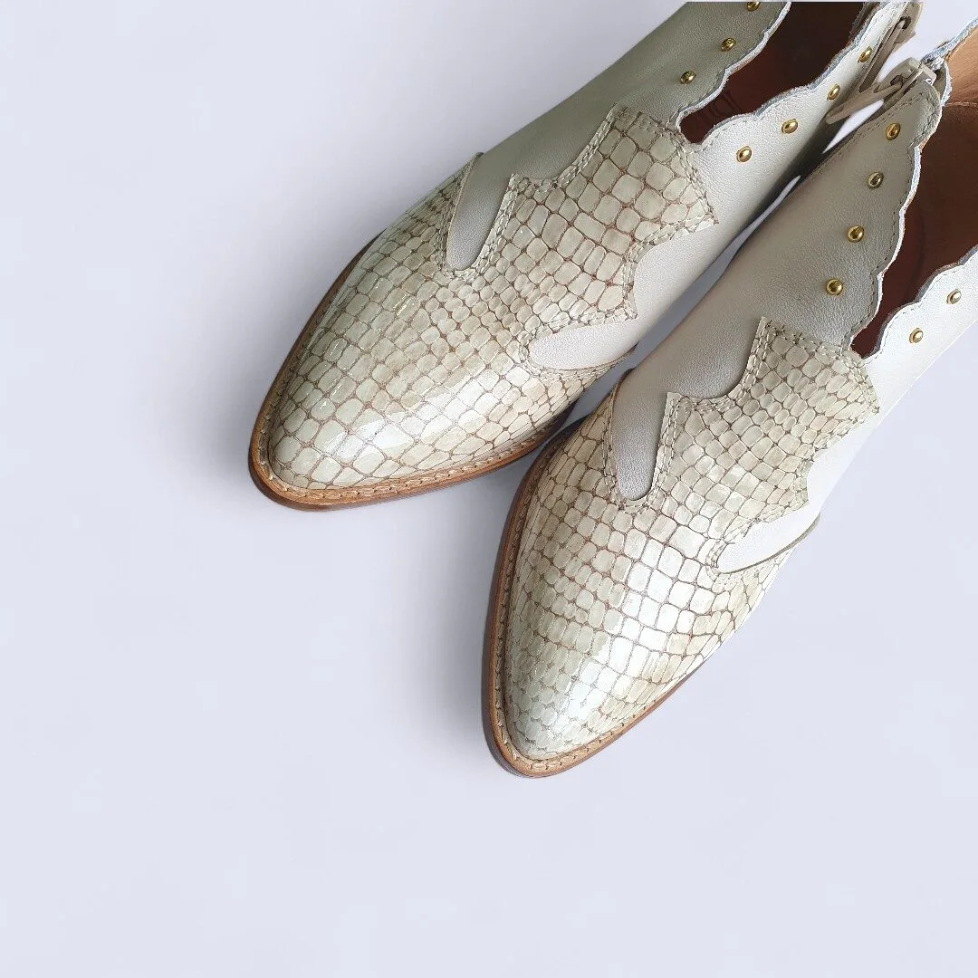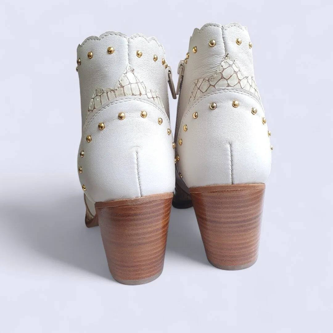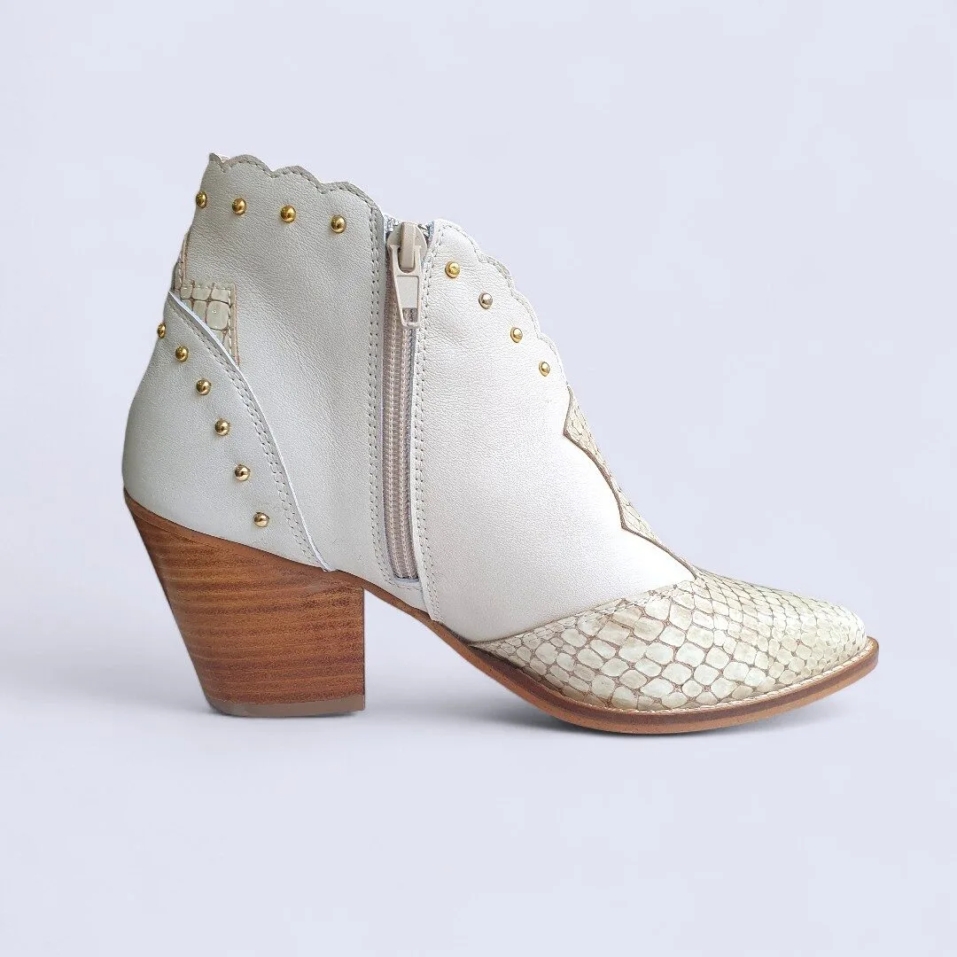 Estas texanas em pele genuína, fabricadas em Portugal, aliam qualidade, conforto e um design cheio de personalidade. O modelo apresenta um fecho lateral discreto, que facilita o calçar, e detalhes em tachas douradas que conferem um toque de sofisticação.
